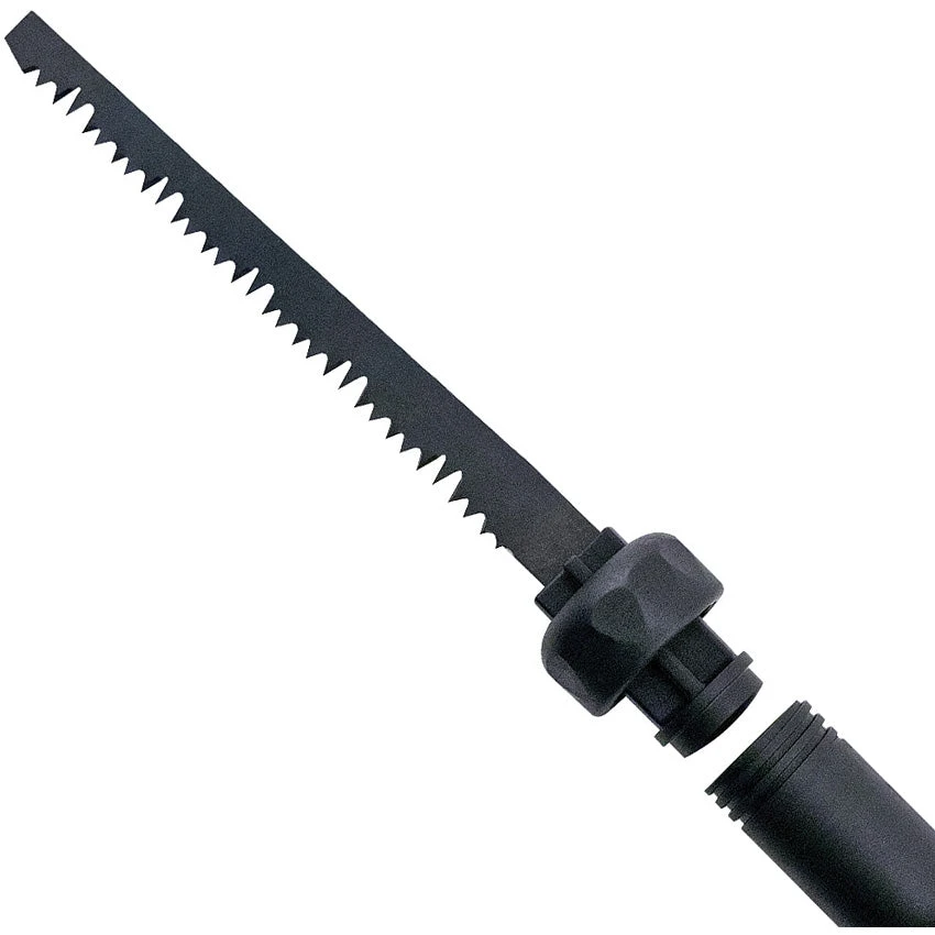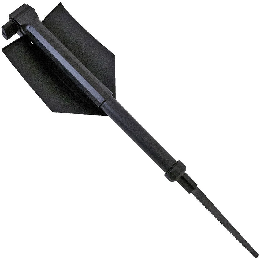 Black finish carbon steel construction. 26″ when open. Collapses to 10 1/4″. Durable shovel head. Bottle opener integrated into handle. Lever locks shovel into four positions. 9″ camp saw stored in handle. Flip saw and fasten into shovel handle for use. Black nylon belt sheath.